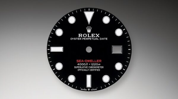 O mostrador preto do Sea-Dweller marcadores de horas e ponteiros de grandes dimensões, reservados aos modelos profissionais. O mostrador exibe o nome “Sea ‑ Dweller” escrito em vermelho, em alusão ao primeiro modelo. A inovadora exibição Chromalight do mostrador supera os limites da visibilidade em ambientes escuros. Proporcionando luminosidade uniforme no mostrador, o brilho azul dura até oito horas – praticamente duas vezes mais que os materiais luminescentes tradicionais.